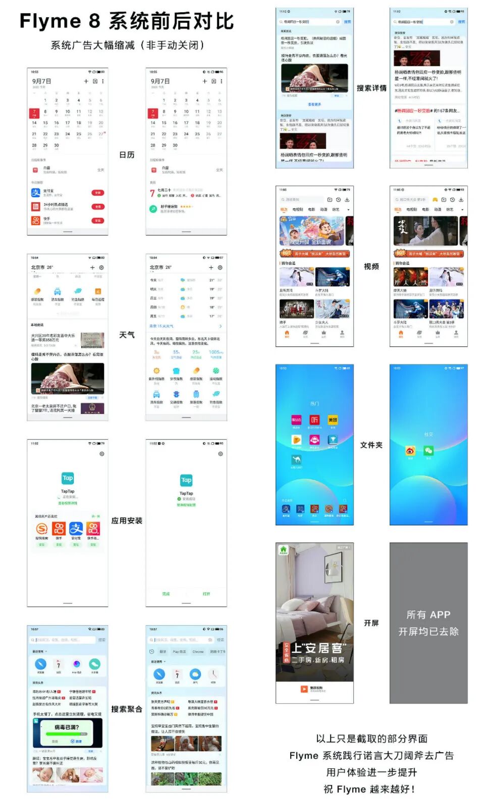 有博主列出了Flyme 8去广告前后对比图,可以看到其系统内像APP的开屏广告、应用安装时的推荐广告等均已消失,