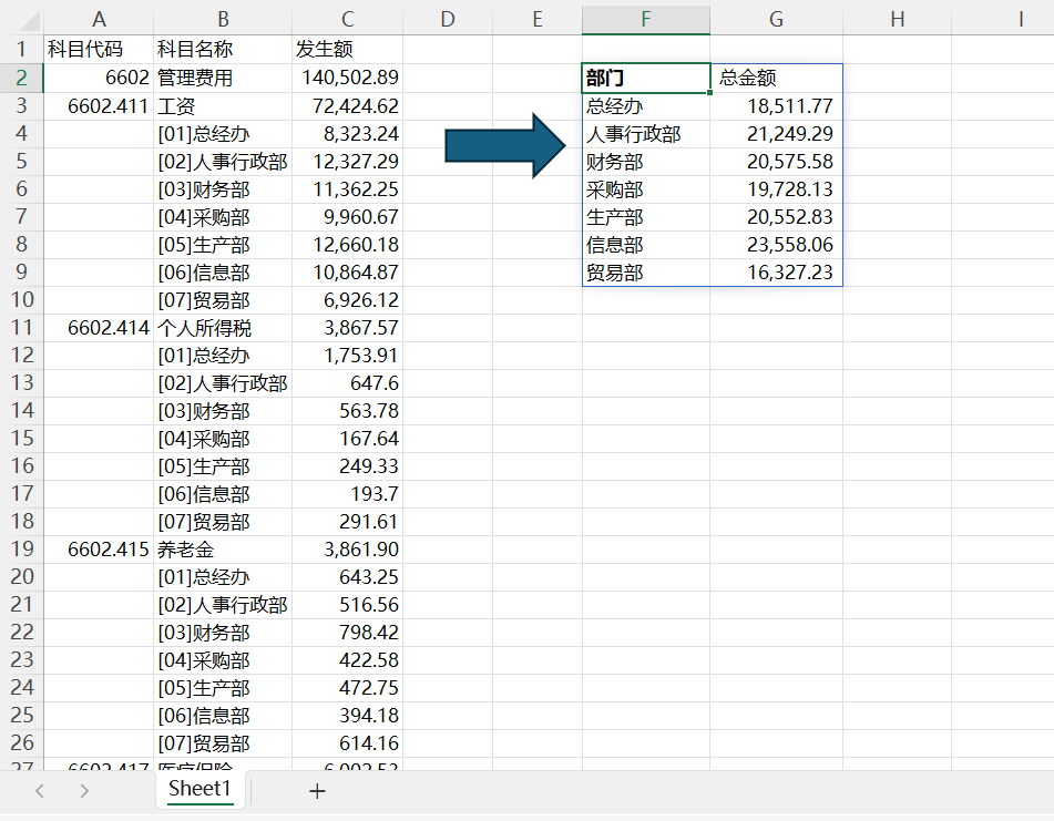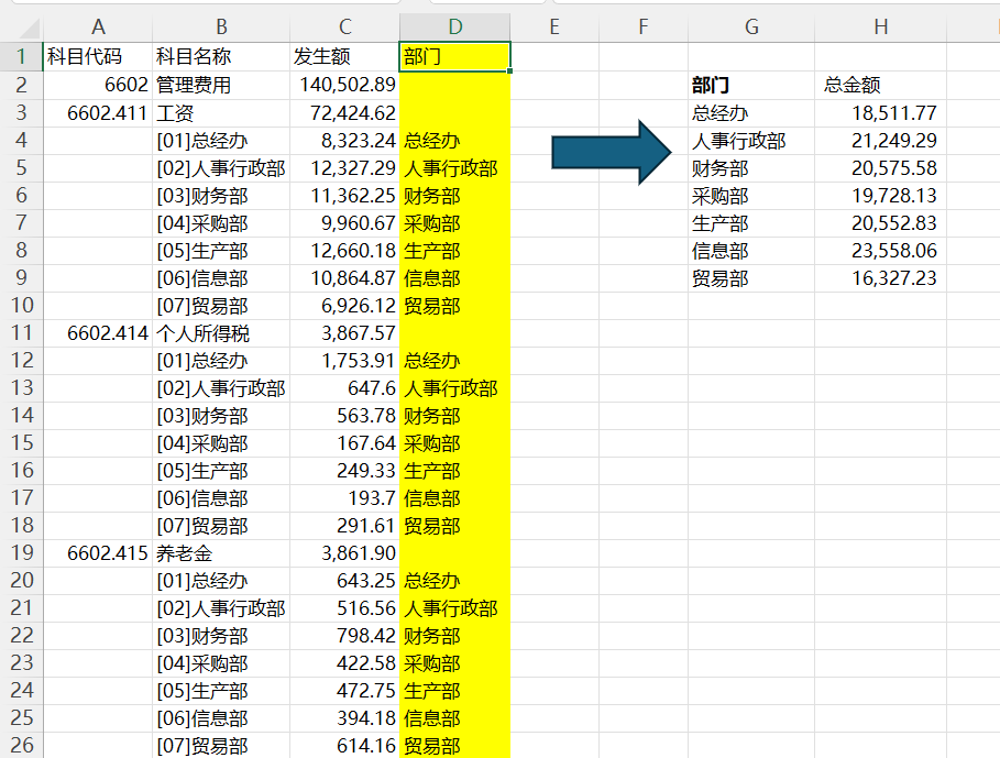 金额合计, SUMIF(科目名称, "*" & 部门名称, 发生额),