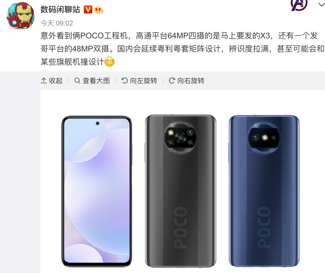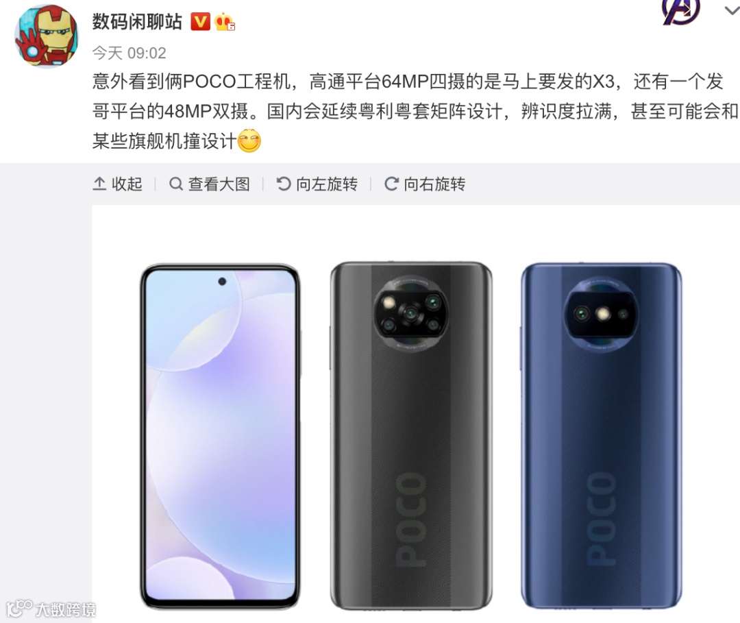 如上图所见,目前披露的小米Poco X3是上图中间那款,后置6400万四摄,而早前曝光的疑Redmi Note 10真机谍照和上图右侧那款相似,4800万三摄。