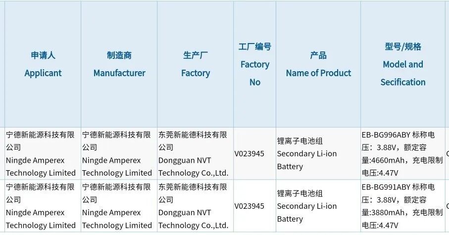 如上图所见,近日认证信息库出现了几款新品的电池。爆料称其分别对应三星Galaxy S21和S21+,其中S21型号SM-G9910,额定电池3880mAh,标准值4000mAh±;S21+型号SM-G9960,额定电池4660mAh,标准值4800mAh左右。