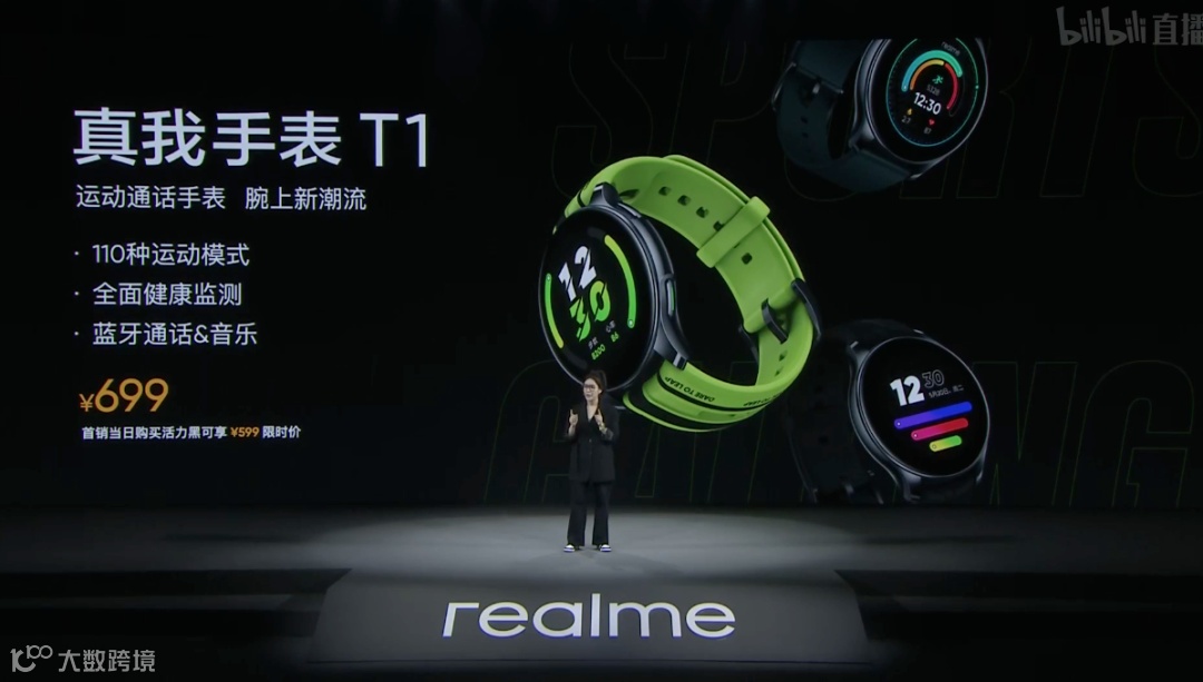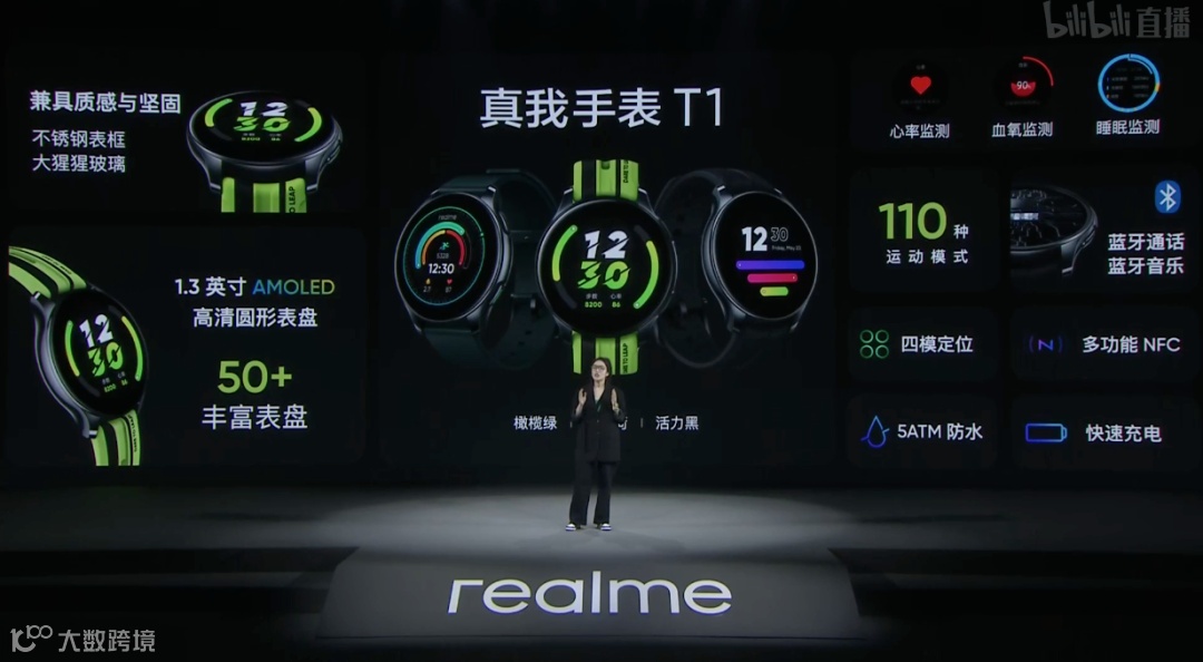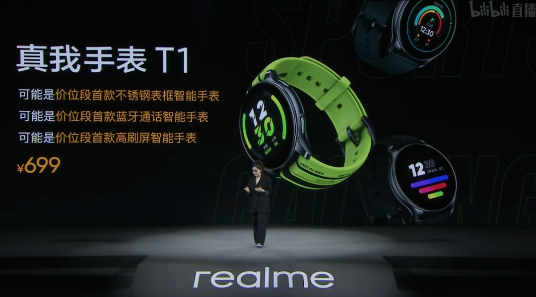 首先是realme国内首款智能手表「真我T1」,主要参数有:1.3英寸的圆形表盘AMOLED屏幕,60Hz屏幕刷新率,平均50fps显示帧数,316L不锈钢金属中框,硅胶或PU皮质表带,3D大猩猩玻璃盖板,提供黑薄荷、橄榄绿、活力黑3个配色,支持AOD息屏表盘;