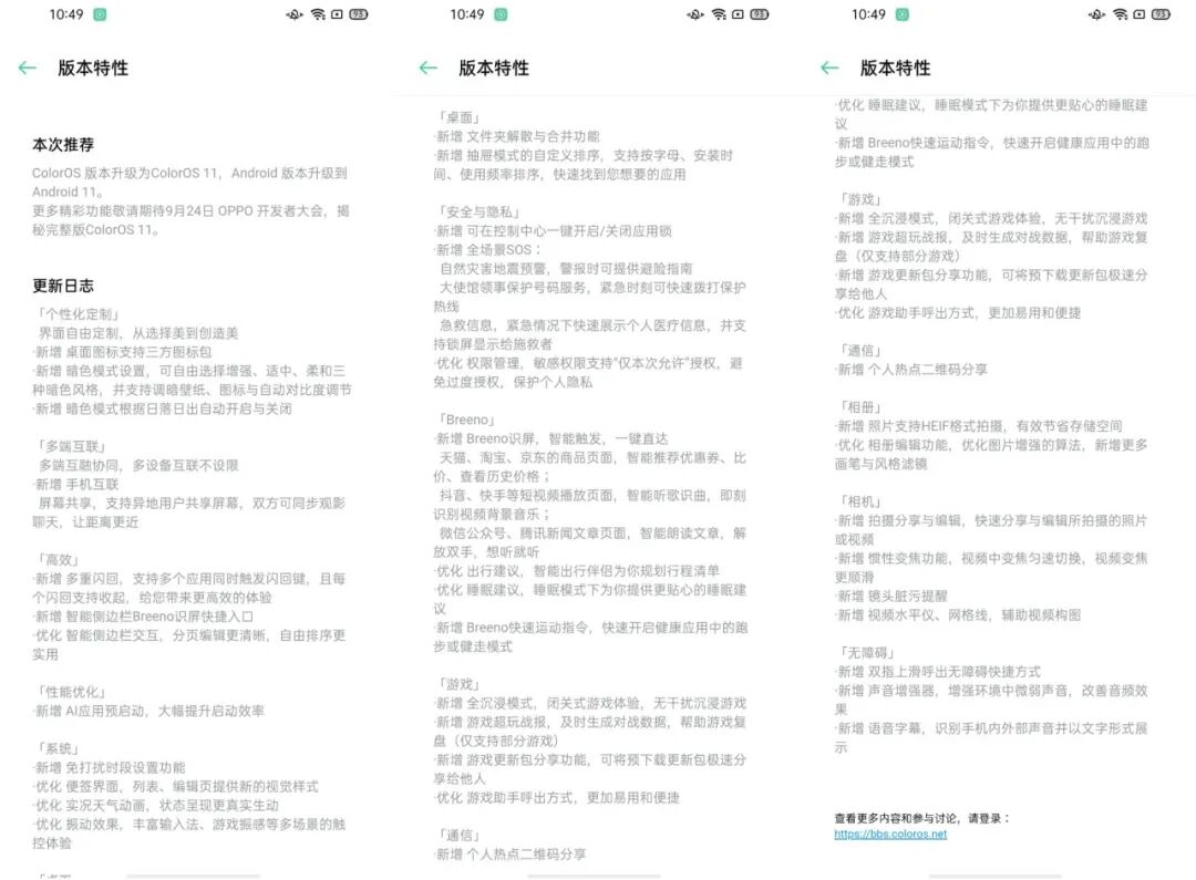ColorOS 11新增AI应用预启动,优化振动效果、丰富多场景的触控体验、新增抽屉模式的自定义排序、在控制中心一键开关应用锁、新增全场景SOS、新增游戏全沉浸模式、优化游戏助手呼出方式等等。
