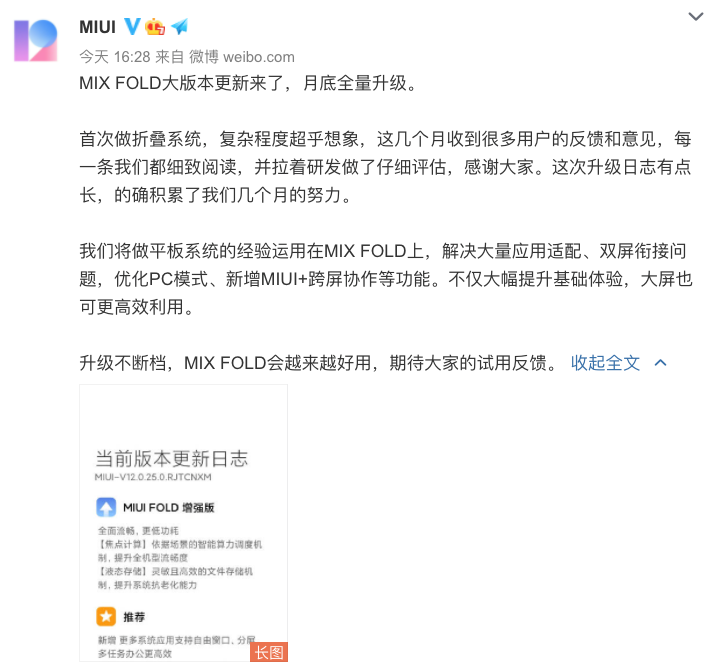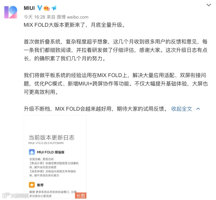说到小米MIX FOLD,其降价后到手价7499元起,应该也是目前最便宜的“折叠平板类”折叠屏手机,今天官方还宣布推送用户等待许久的系统固件更新,版本号MIUI-V12.0.25.0.RJTCNXM,更新日志有一大串,概括总结就是该适配的都是配了,该优化的都优化了,官方表示月底全量升级,不知道大家是否感兴趣?🤔