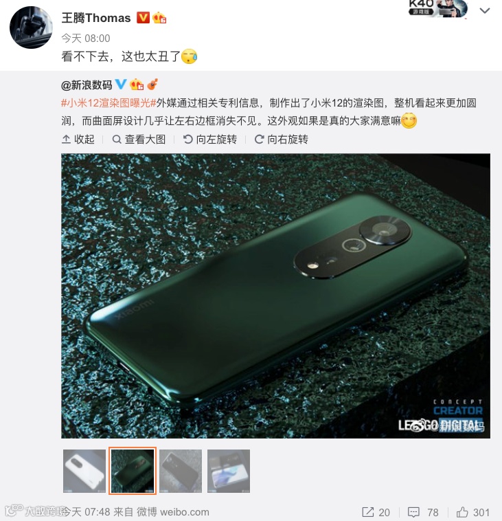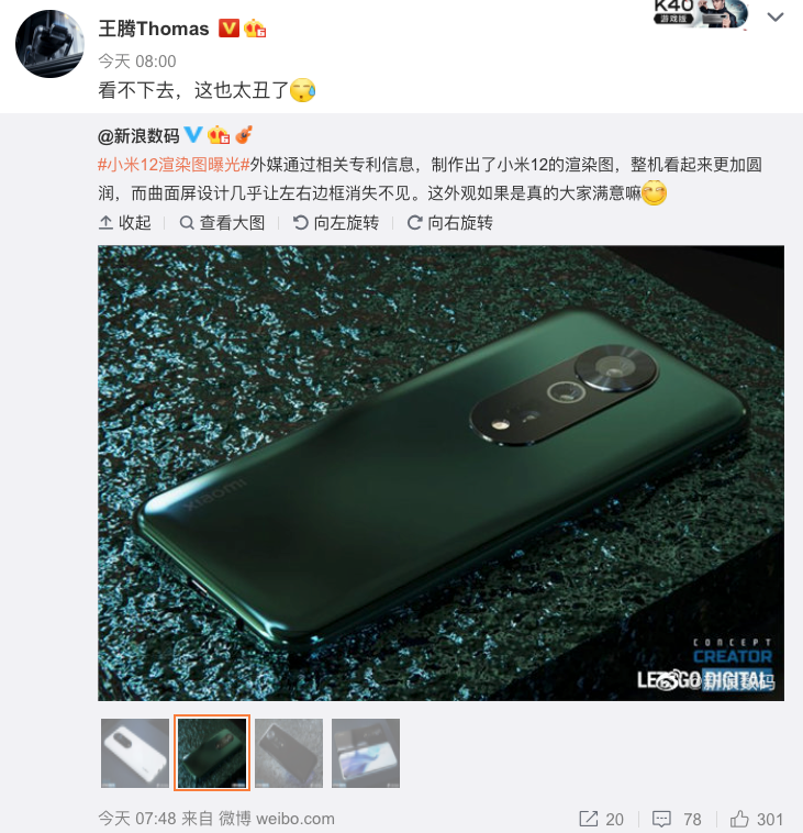 当然了,这组谍照也遭到了小米公司 Redmi产品总监王腾的回应与辟谣,表示「看不下去,这也太丑了」