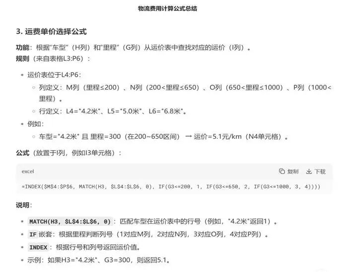 根据表格中条件,请列出车型选择函数公式、里程计算函数公式、运费单价选择公式