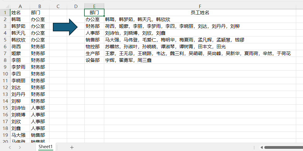 =TEXTJOIN(",",TRUE,IF(B2:B47=E2,A2:A47,""))