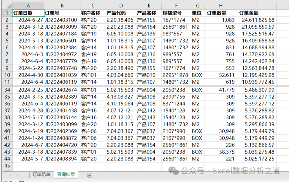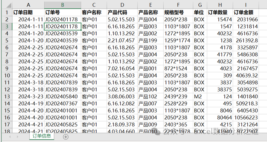 Excel工作簿“简单表格的数据基本查询.xlsm”里的工作表“订单信息”全部字段数据