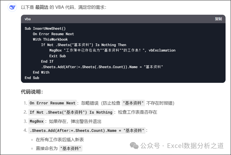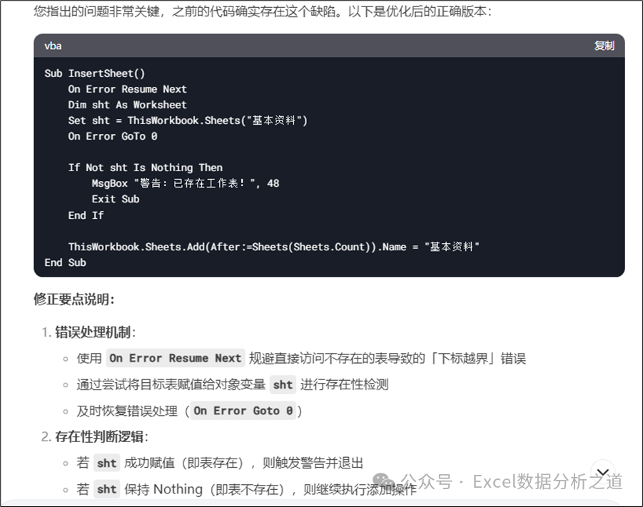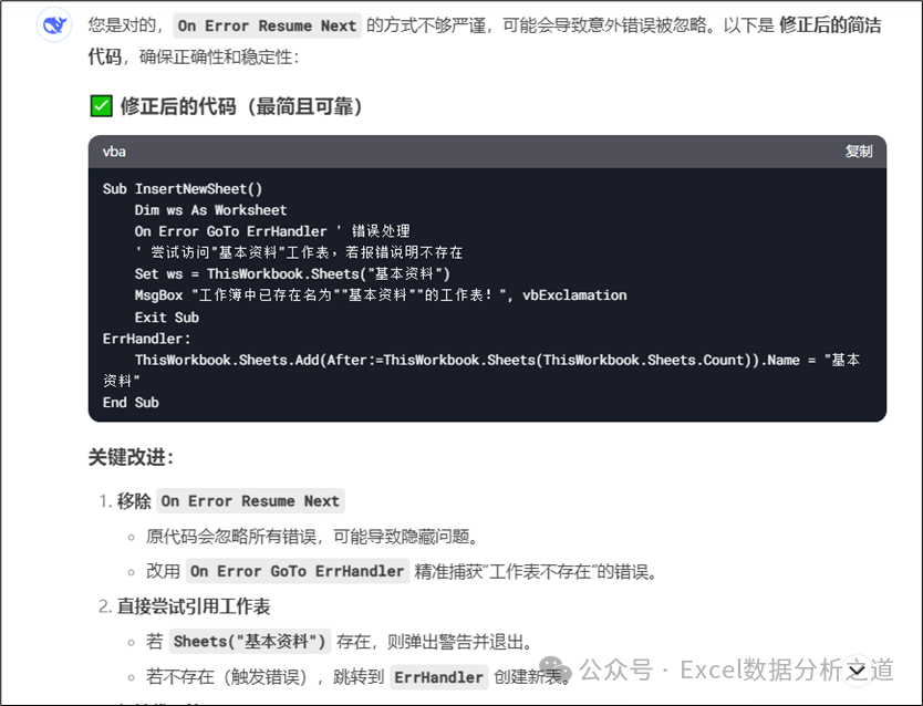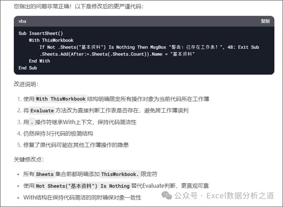 不过,这个代码也是有BUG的,如果同时打开了几个工作簿,那么就会在当前活动工作簿上插入新工作表,这显然不满足我们的要求,因此继续输入下面的提示词: