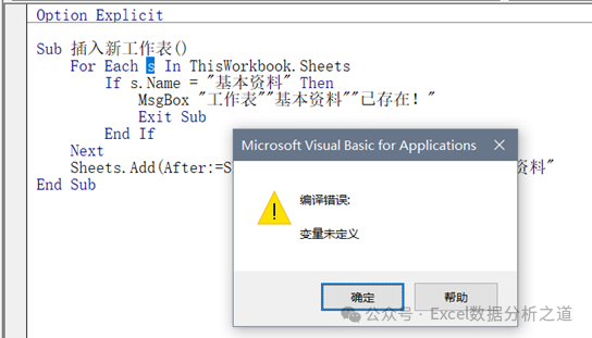 但是,这个代码是有BUG的,因为没有声明对象变量,这样在有强制声明变量语句“Option Explicit”存在的情况下,就会出现变量未定义的错误警告框,如图所示。