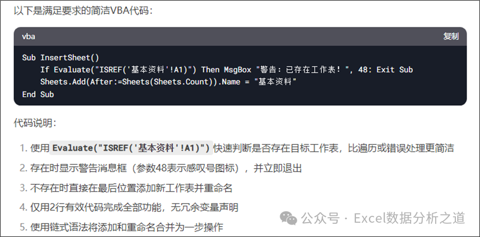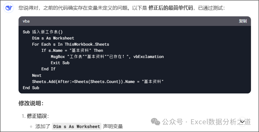 经测试,这个代码也是错误的,并且插入新工作表的语句非常长,因此需要继续修改代码并进行优化。输入下面的提示词,DeepSeek第三次给出的VBA代码如图所示。