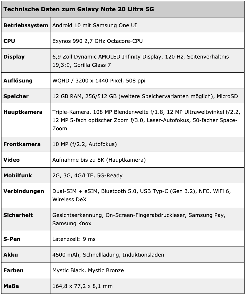 核心配置上,三星Galaxy Note 20 Ultra还是双处理器版本,国行骁龙865 Plus支持双模5G,S Pen延迟低至9ms,支持蓝牙5.0,Wi-Fi 6,无线DeX,4500mAh电池,机身三围164.8*77.2 *8.1mm。