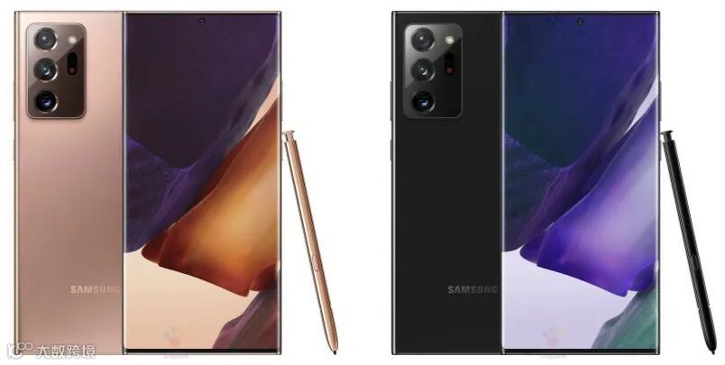 如上图所见,三星Galaxy Note 20 Ultra提供古铜色和黑色两个版本,据说白色是后面再推出,居中挖孔曲面屏,背部是硕大的矩形相机模组。winfuture表示其规格为6.9英寸3200*1440分辨率的Dynamic AMOLED屏,120Hz屏幕刷新率,首发大猩猩7代玻璃。