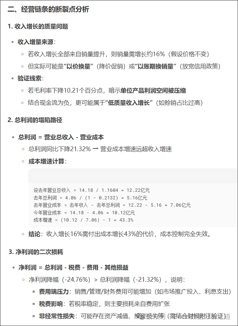 而毛利率断崖式下跌是核心问题,可能原因包括:原材料/生产成本大幅上涨;产品降价促销导致价格下降;产品组合向低毛利产品倾斜;生产效率降低导致单位成本上升等。