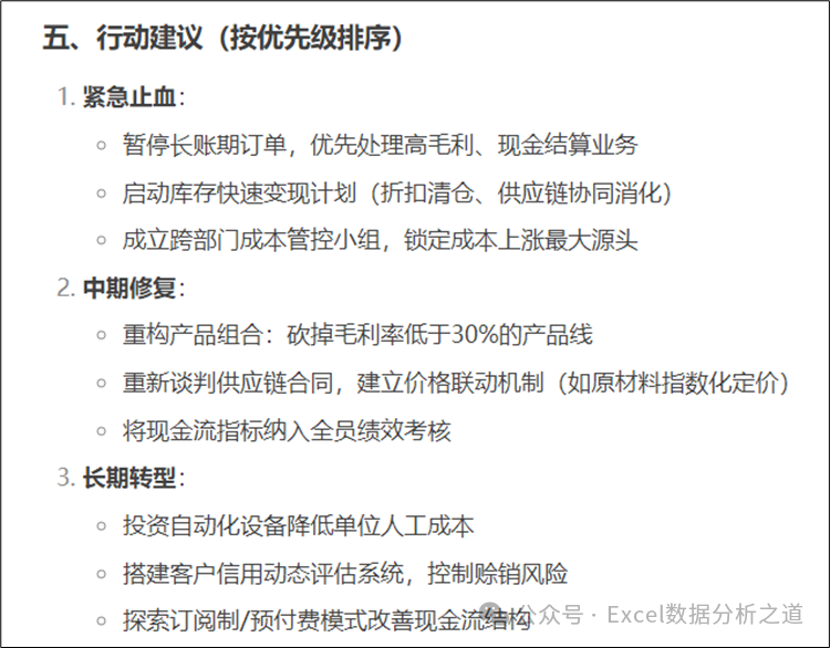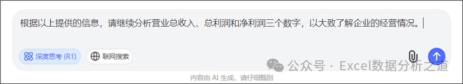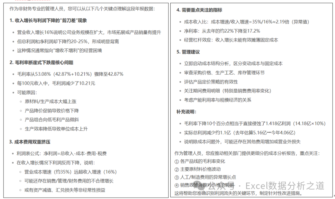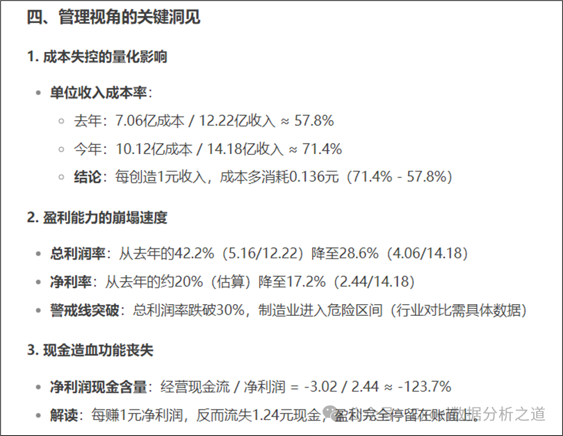 仔细阅读DeepSeek给出的解析信息,再结合企业实际情况,去进一步挖掘分析业务数据。例如,原材料成本是否同比大幅上涨?是哪些原材料成本上涨?期间费用特别是销售费用出现了什么样的变化?是否存在异常项目?等等。
