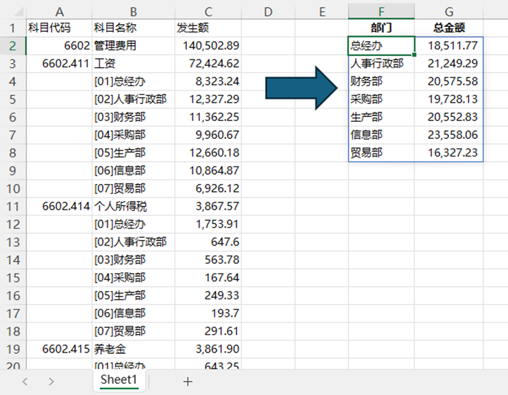 下图的左侧A列至C列是从系统导出的数据,现在要设计一个通用公式,计算每个部门的合计金额,如F列至G列所示。