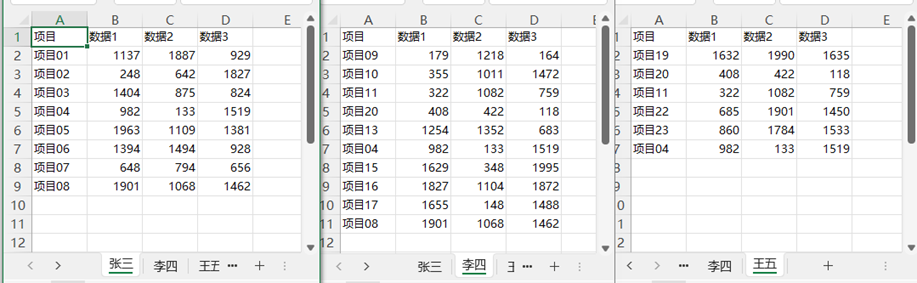 下图是三个工作表数据,有些数据在三个工作表或者某两个工作表都存在,现在的任务是将这三个工作表的不重复数据合并为一个新表。