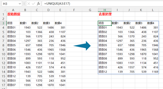 如果想要保留原始数据区域,而将去重后的数据唯一值保存到新位置,则可以使用UNIQUE函数来实现了,公式也很简单,根据需要合理设置UNIQUE函数的参数即可。