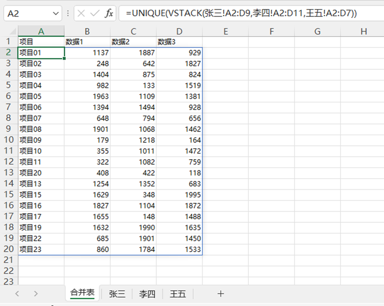 = UNIQUE(VSTACK(张三!A2:D9,李四!A2:D11,王五!A2:D7))