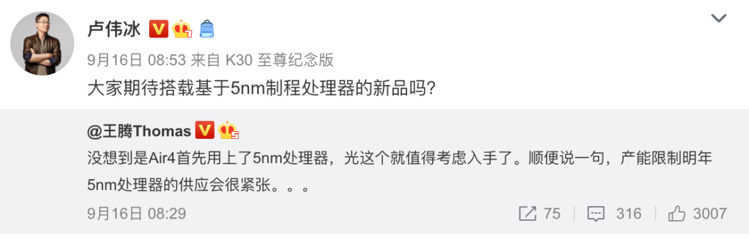 小米这边卢伟冰和王腾表示5nm处理器产能限制,所以明年骁龙875等处理器供应会很紧张,暗示售价会高或者备货...?🤔