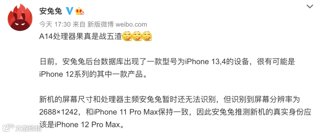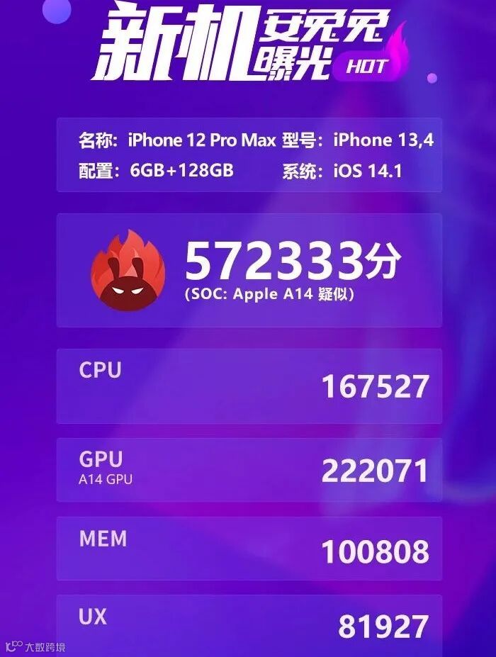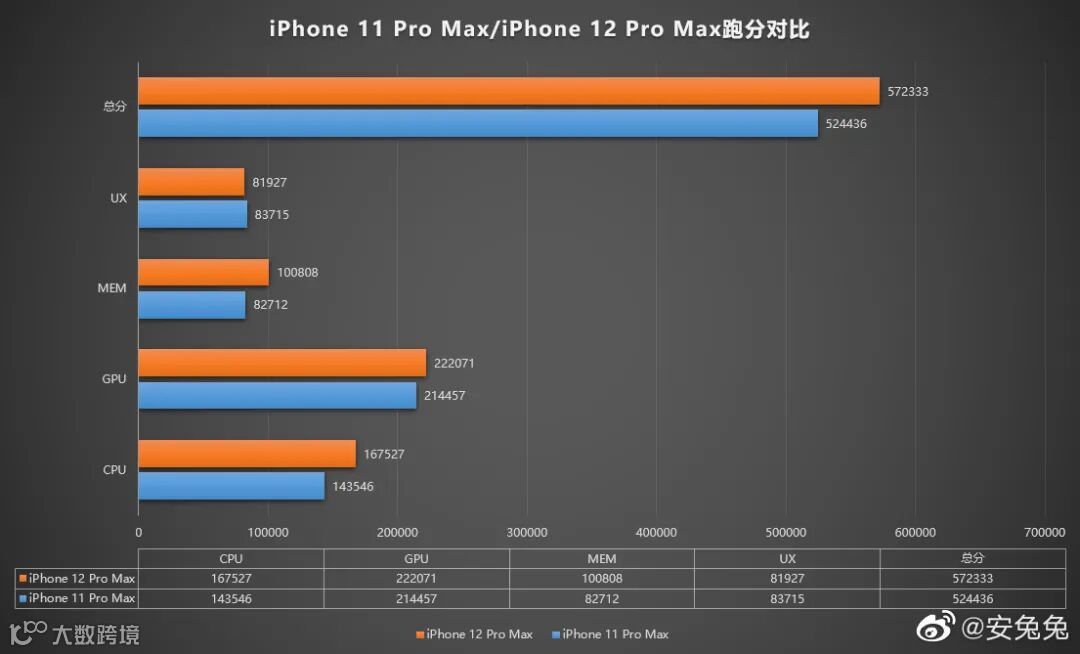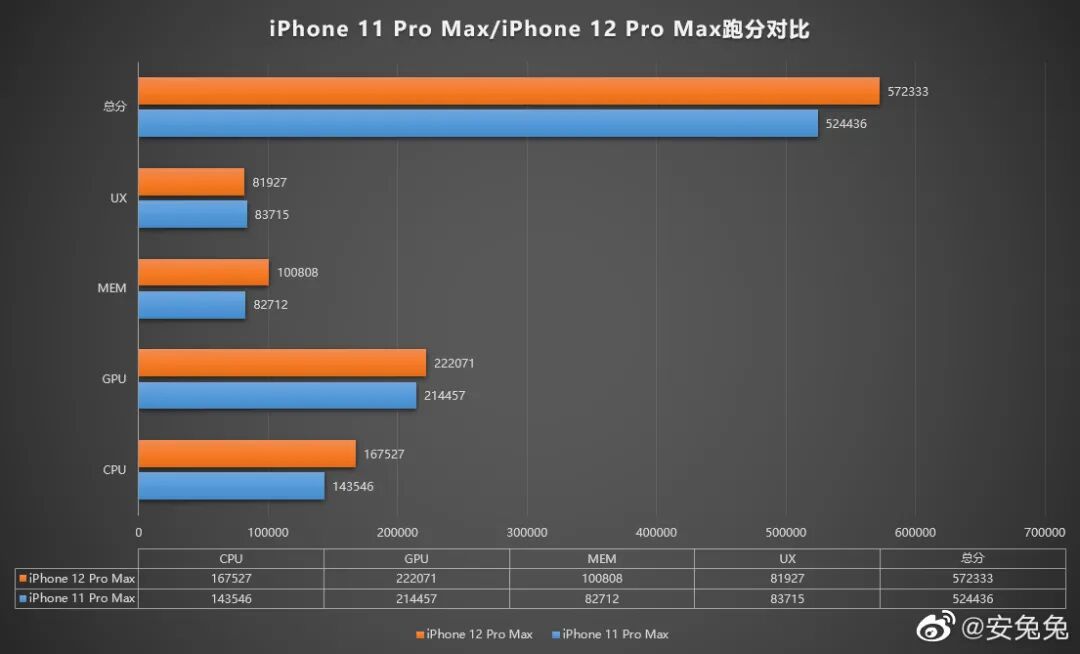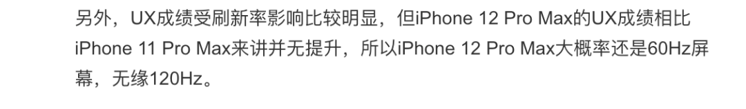 安兔兔还表示,从跑分来看,iPhone 12 Pro Max屏幕分辨率为2688×1242,和iPhone 11 Pro Max一致,另外其UX跑分成绩表现一般,极大可能意味着没有高刷,还是60Hz,但毕竟提取的是一次跑分,所以最终可能会有些许变动,供大家参考。