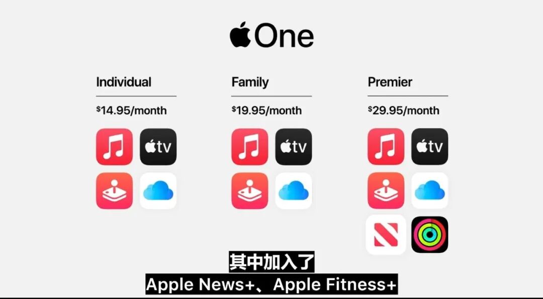 另外还有个Apple One服务,整合苹果自带的音乐、新闻、iCloud、TV等,最低14.95美元/月,国内应该不需要,这里就不再详细提。