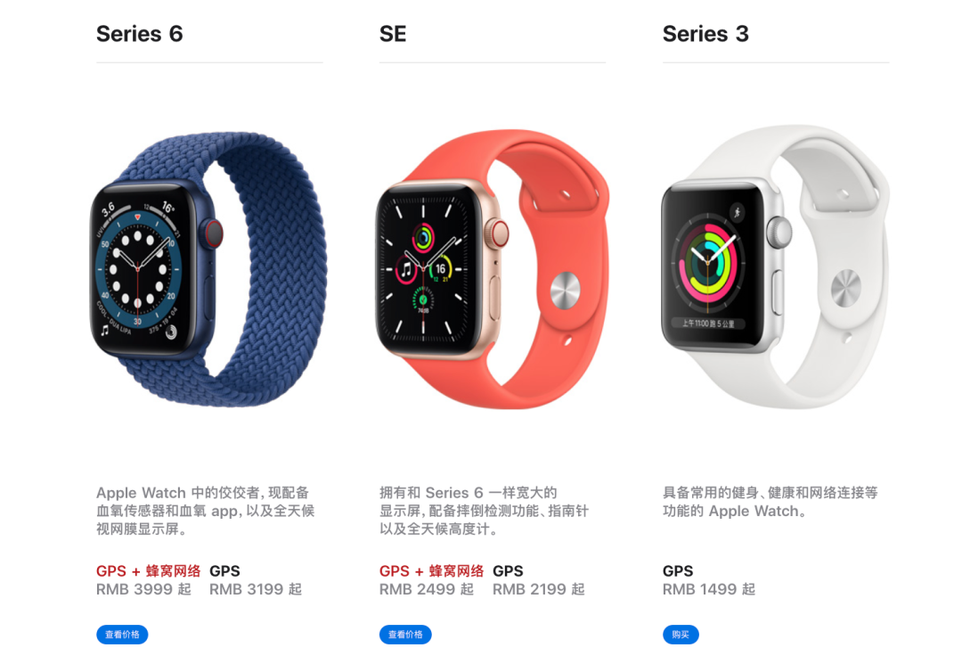 最后就是Apple Watch S6和Apple Watch SE的价格,S6①40mm款:GPS版3199,蜂窝网络版3999;②44mm款 GPS版3399,蜂窝网络版4199。SE①40mm款:GPS版2199,蜂窝网络版2499;②44mm款:GPS版2399,蜂窝网络版2699。
