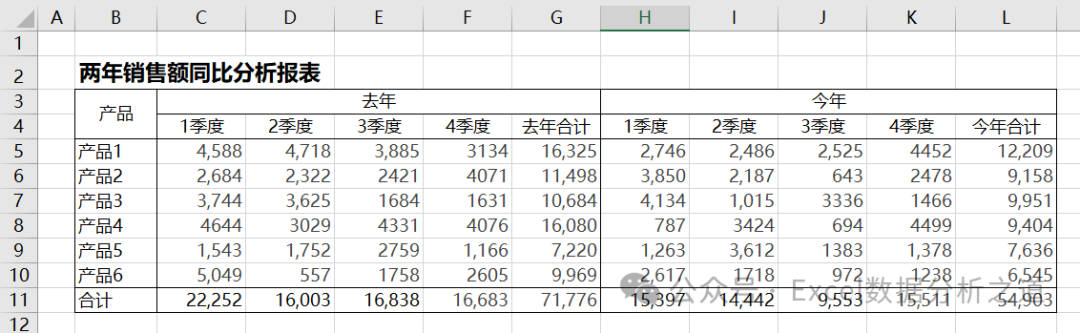 第2部分:一个同比分析报表,该报表有5列数据,从左往右分别是产品名称、去年销售总额、今年销售总额、同比增减额、同比增长率;