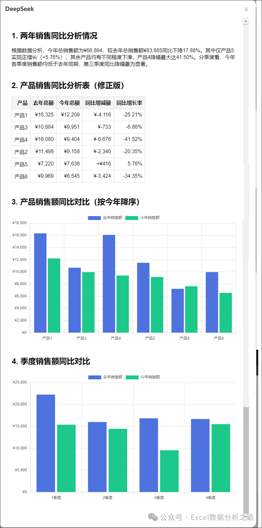 <p>根据数据分析,今年总销售额为¥68,894,较去年总销售额¥83,885同比下降17.88%。其中仅产品5实现正增长(+5.76%),其余产品均有不同程度下滑,产品4降幅最大达41.50%。分季度看,今年各季度销售额均低于去年同期,第三季度同比降幅最为显著。</p>