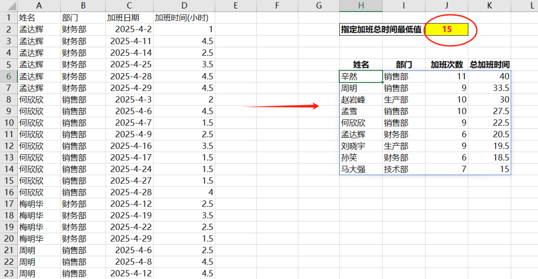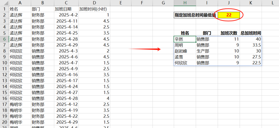 使用FILTER函数对这个数组进行筛选,筛选条件是加班总时间大于指定的数值(假设为A),FILTER函数的返回值是新的数组(假设为Z) Z = FILTER( Y, X4>=A ) -