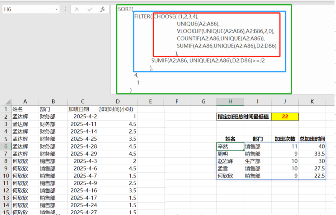 统计表有4列数据:姓名,部门,加班总次数,加班总时间,前2列在原始表个是存在的,但是需要处理不重复数据;后2列需要对每个人计算出来(一个是计数,一个是求和),因此,需要使用CHOOSE函数来构建数组。 -