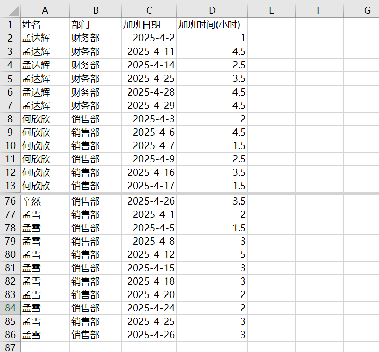 第4列加班总时间,可以使用SUMIF函数来求和(假设为X4): X4 = SUMIF( A2:A86,UNIQUE(A2:A86),D2:D86 ) -