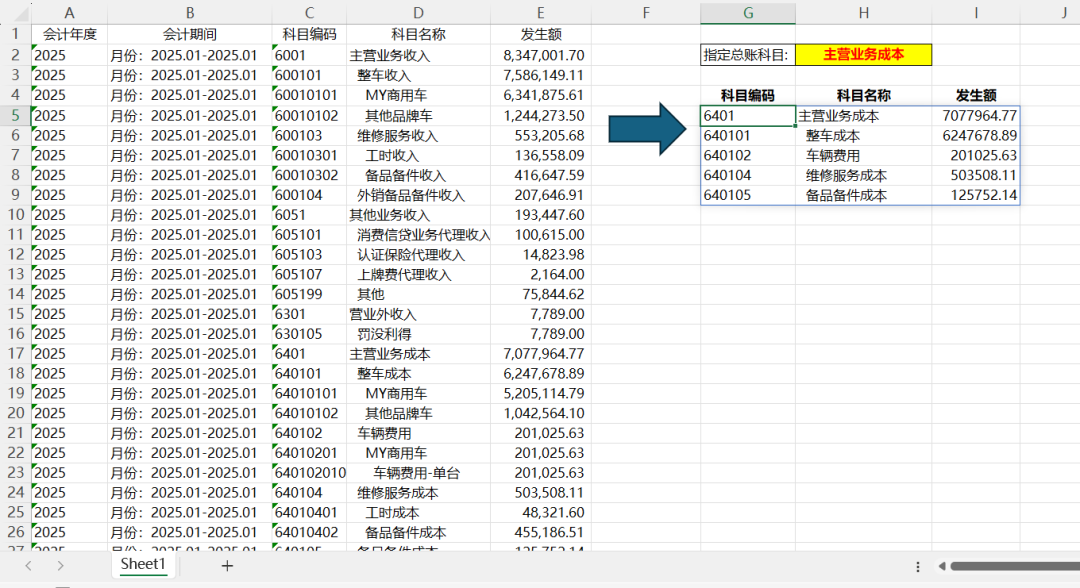 一级明细数据, FILTER(数据区域,(LEFT(科目编码,4)=总账科目编码)*(LEN(科目编码)=6)),