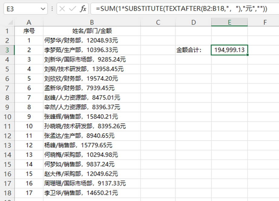 SUBSTITUTE函数的返回值是文本字符串,因此清除“元”后的数字是不能使用SUM函数直接求和的,需要转换为数值,最简单的方法是乘以数字1: