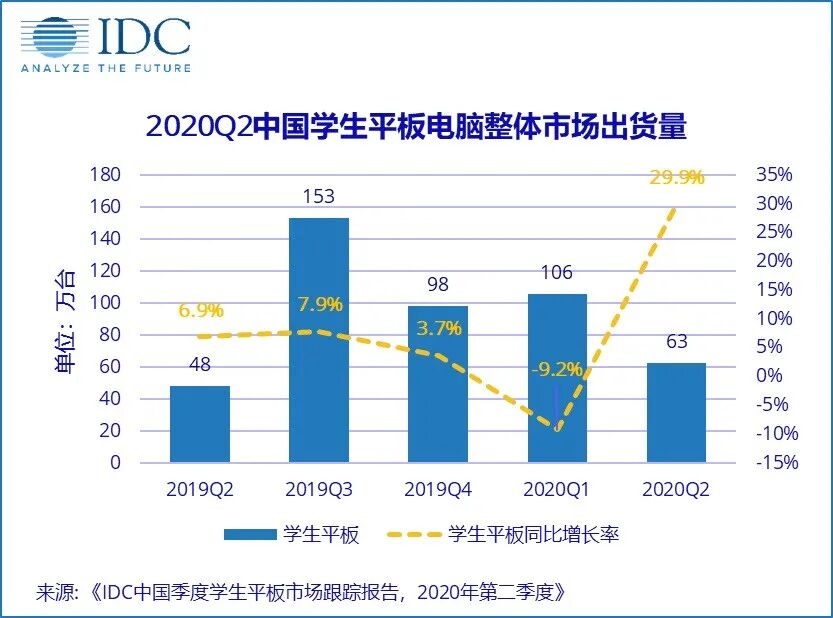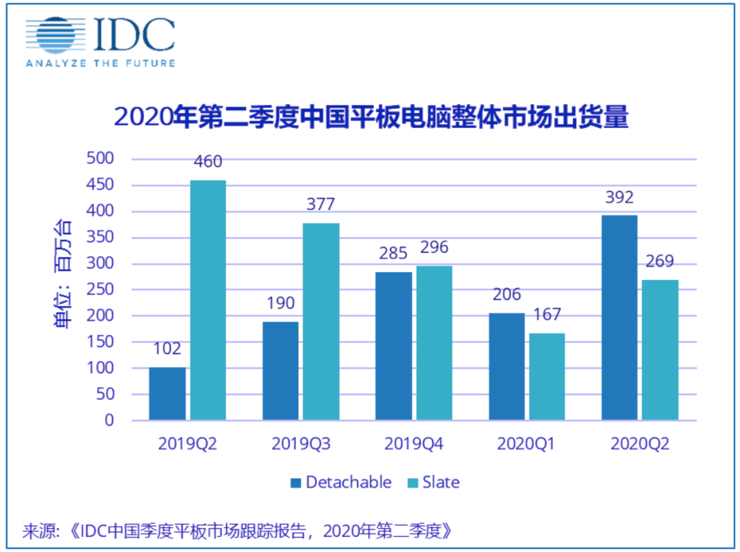 IDC发布的数据表示,2020年第二季度中国平板电脑市场出货量约661万台,同比增长17.7%。(注,上图中的Detachable和Slate分别对应 可插拔键盘平板电脑、传统直板式平板电脑)