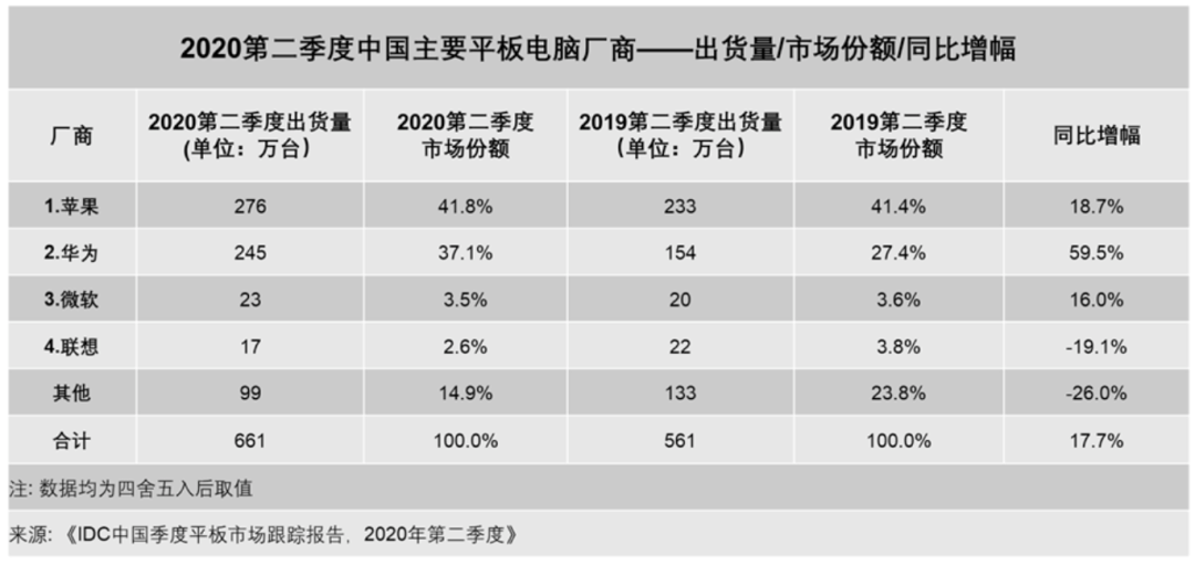 具体到TOP 4依次是①苹果iPad 出货量276万台,41.8%市场份额,同比增长18.7%;②华为245万台,37.1%市场份额,同比增长59.5%;③微软23万台,3.5%市场份额;④联想17万台,2.6%市场份额。