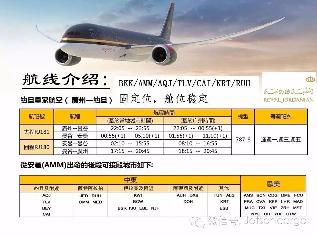 捷晨代理广州皇家约旦航空RJ,舱位好时效稳定,皇室般的服务是您优先的选择。。。