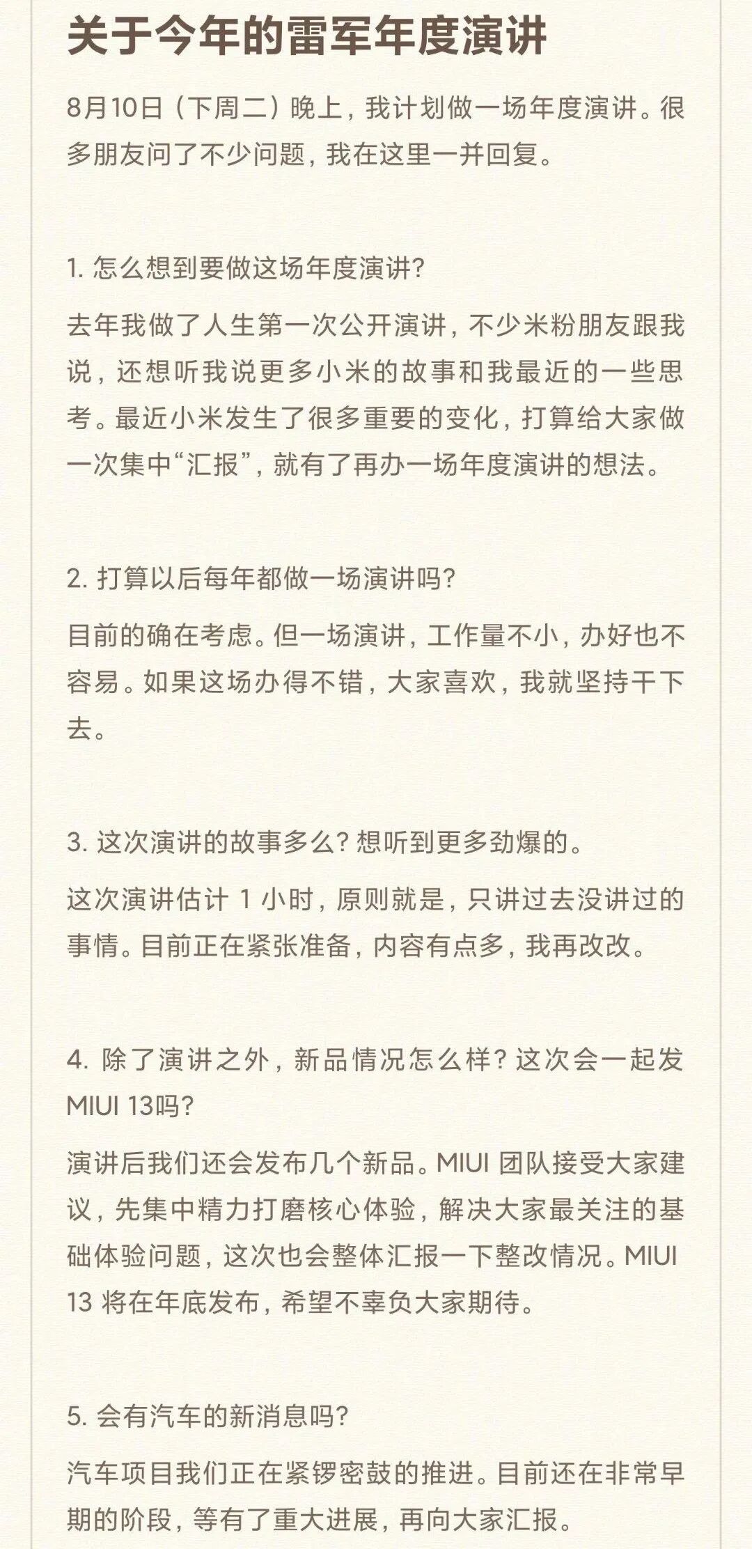 今天上午,小米终于开启了新品预热,正式宣布2021小米雷军年度演讲定档 8 月 10 日(下周二)晚 19:30举行。