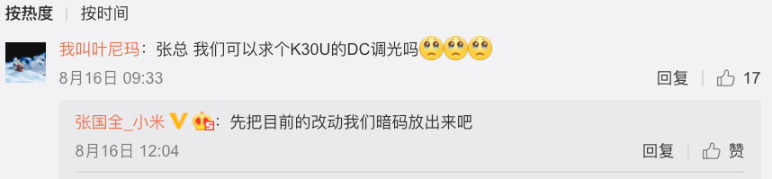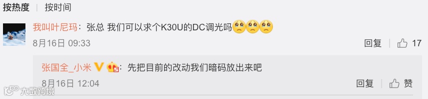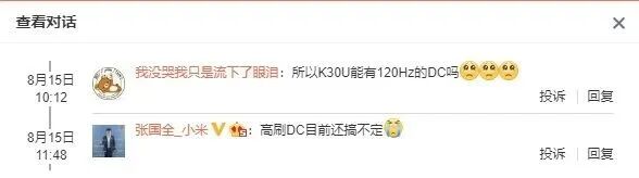 如上图所见,小米手机 系统软件部总监张国全在微博回应网友表示「高刷DC目前还搞不定」;至于部分网友反馈的“K30至尊纪念版高刷掉帧希望尽快解决”,张国全也表示「屏蔽了一些体验不深的App,将逐渐放开。」。估计后期调教好会再官方OTA吧。