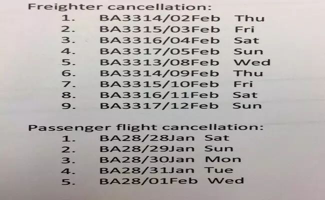 收到香港英艇(BA)的通知,鉴于中国农历春节即将来临,对期间的客货机作了以下的航班取消决定, 对此次取消航班给广大客户带来不便请多多包涵。