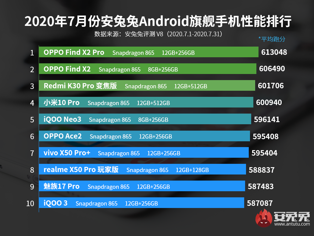 近日,安兔兔更新了2020年7月份Android中高端手机性能榜单,来看看跑分具体排名~(数据统计的时间为2020年7月1日到7月31日,榜单内成绩为统计到的平均成绩,且单一机型数据统计量>1000条,数据均基于安兔兔V8版本计算。)