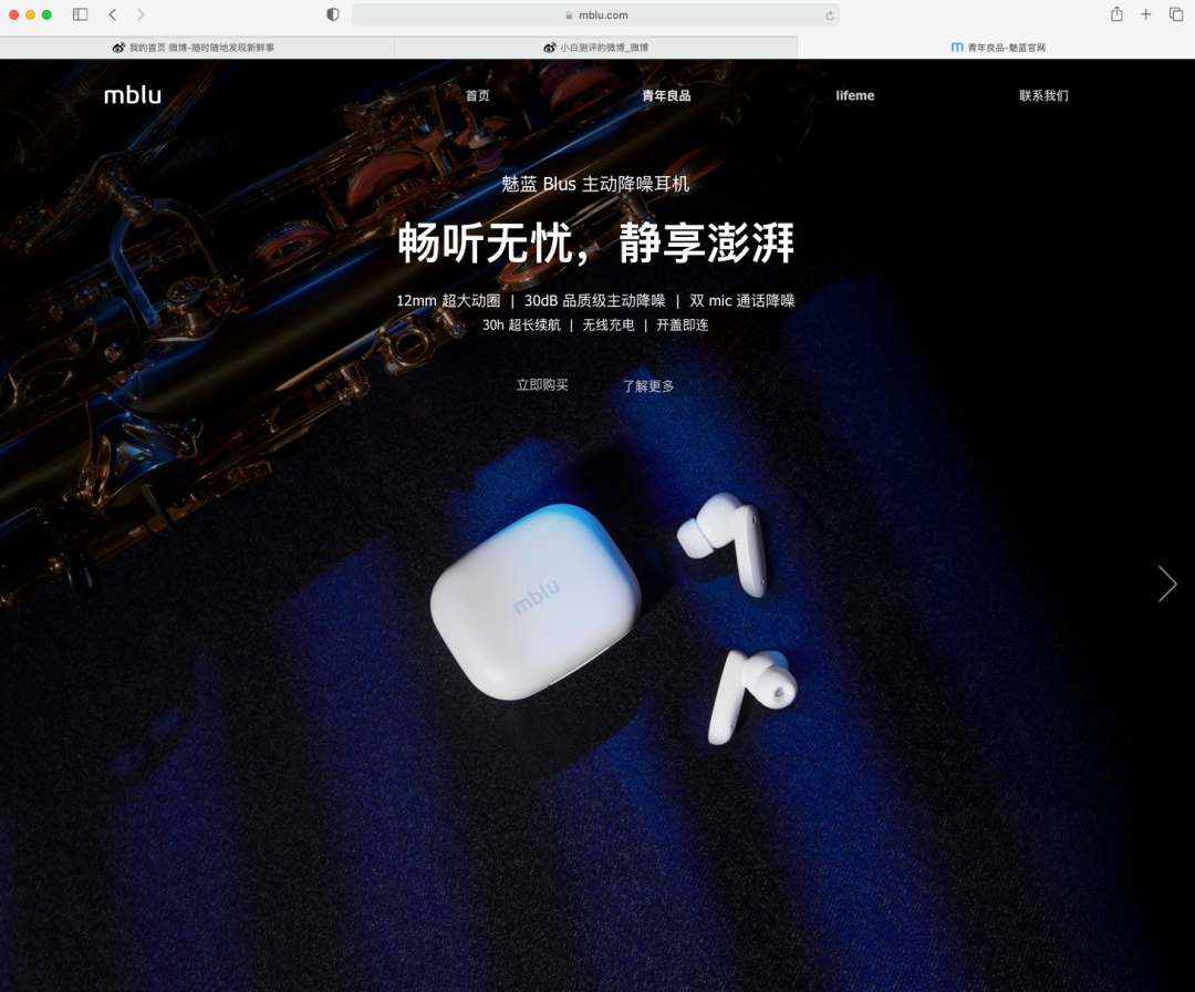 现在魅蓝官网(mblu.com)也已经上线了,首页就是昨天刚发布的青年良品魅族Blus主动降噪耳机。