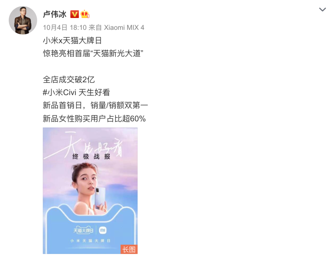【行情】小米Civi定位成了?卢伟冰:购买女性用户占比超60%