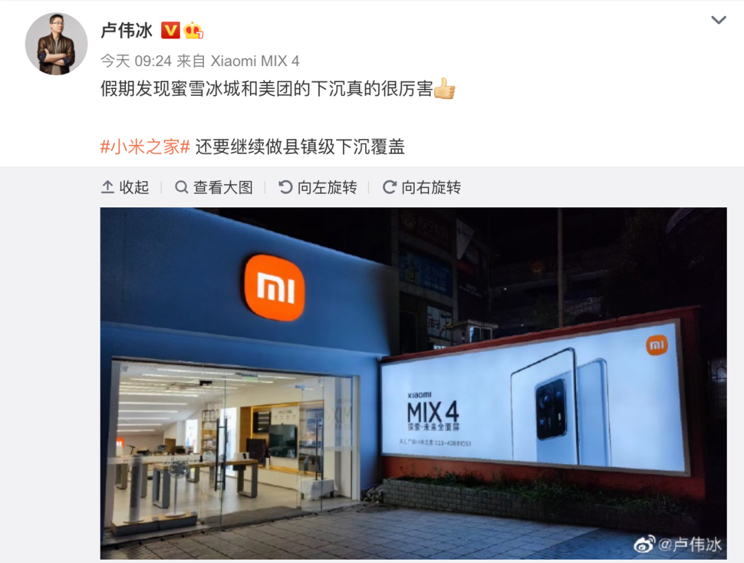 此外,卢伟冰还表示假期感慨,小米之家还要继续做县镇级下沉覆盖。