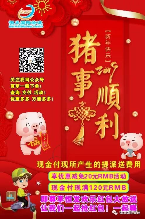 2019年猪年到来了,请关注我司公众号,尊享一键下单,线上查件,支付,参与恒发欢乐红包大放送,感恩促,超值惠!这个“价”期,您该出手了,活动多多,优惠多多,让们一起嗨起来