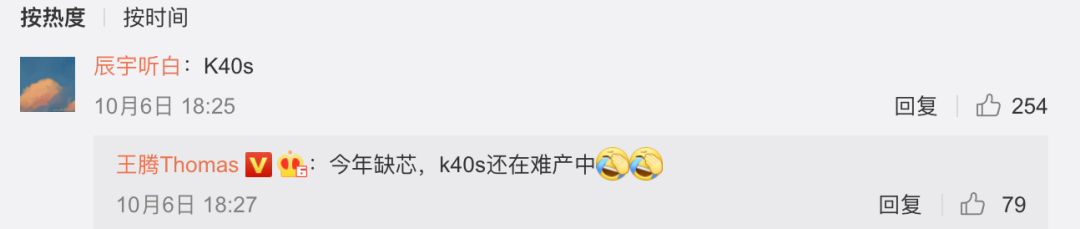 如上图所见,Redmi王腾在回复网友关于K40S的留言时表示「今年缺芯,K40S还在难产中」。