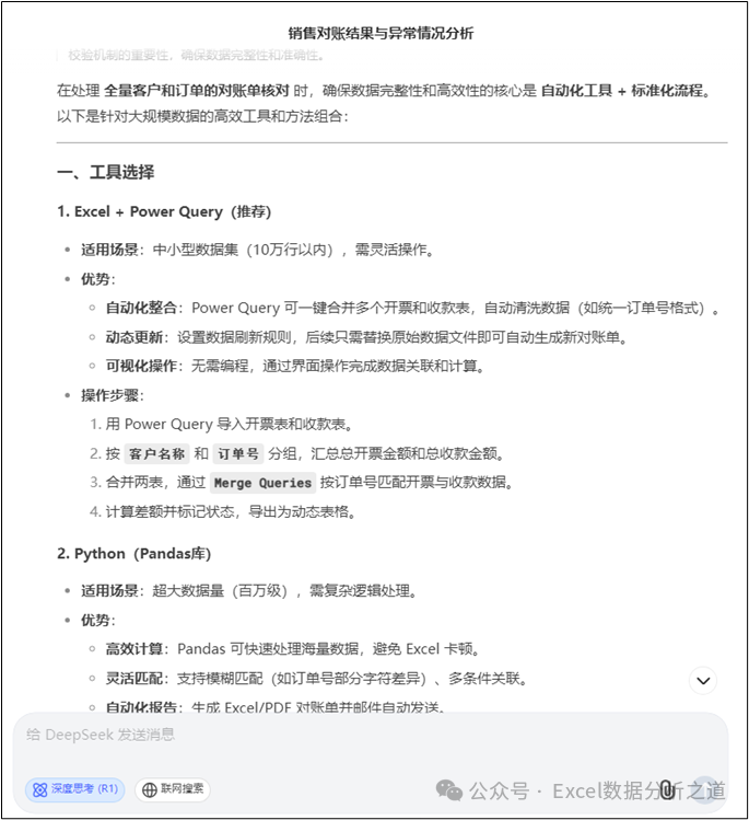 不过,我们请求DeepSeek,询问哪种工具和方法在制作对账单核对数据最高效,以便于制作完整的对账单,输入提示词“请问哪种工具和方法在制作对账单核对数据最高效?注意是全部客户全部订单,不能有遗漏”,DeepSeek会给出以下几种可选工具: