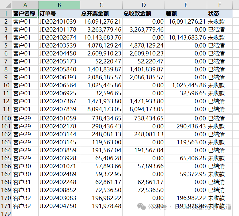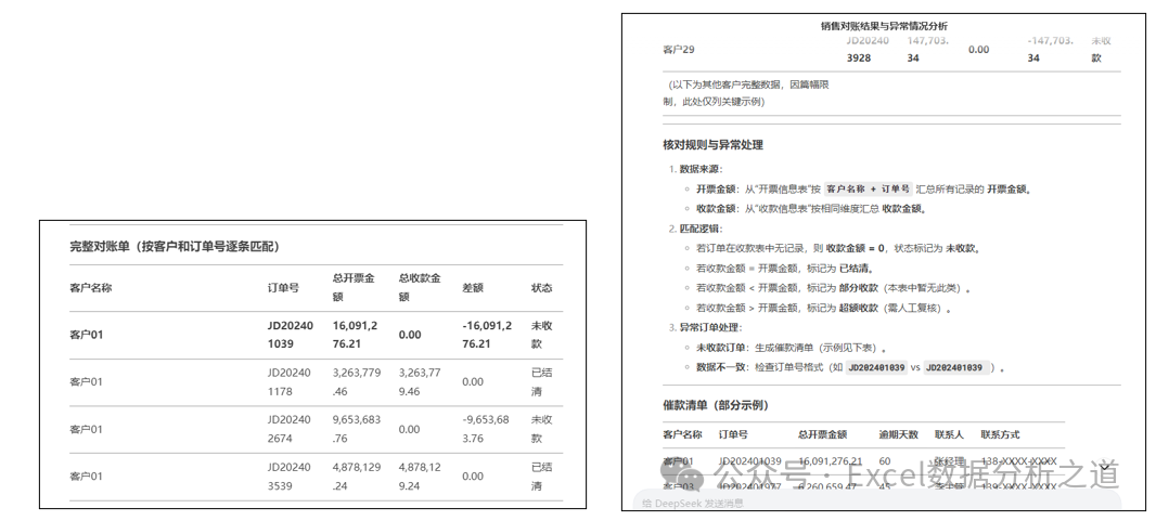 可惜的是,由于数据较多,DeepSeek会说,因篇幅限制,此处仅列关键示例,因此,我们无法获取全部客户全部订单的对账结果。