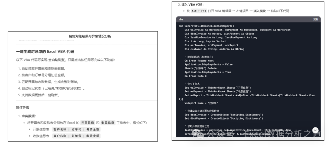 输入提示词“我觉得这些方法还是比较麻烦的,请给出能够一键制作对账单的Excel VB代码”,就会得到下面的Excel VBA代码,