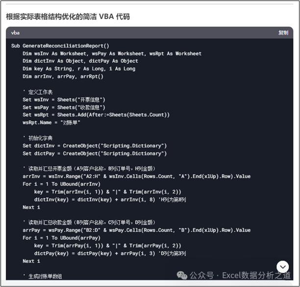 但是,浏览代码后,发现这个代码看起来很帅繁琐,不简洁,可以继续提问,输入提示词“这个代码太繁琐了,有没有更简洁的VBA代码?注意开票信息表中,A列是客户名称,B列是订单号,H列是要核对的开票金额;收款信息表中,B列是客户名称,C列是订单号,D列是要核对的收款金额;请根据这个具体表格结构,给出简洁的VBA代码”,把问题具体化,给出具体的核对字段所在列,那么DeepSeek就给出了简化的VBA代码: