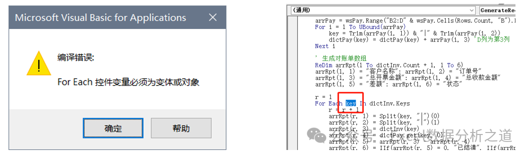 将这个代码复制到Excel中,运行会出现错误,检查代码,就会发现错误点出现在变量“key”上: